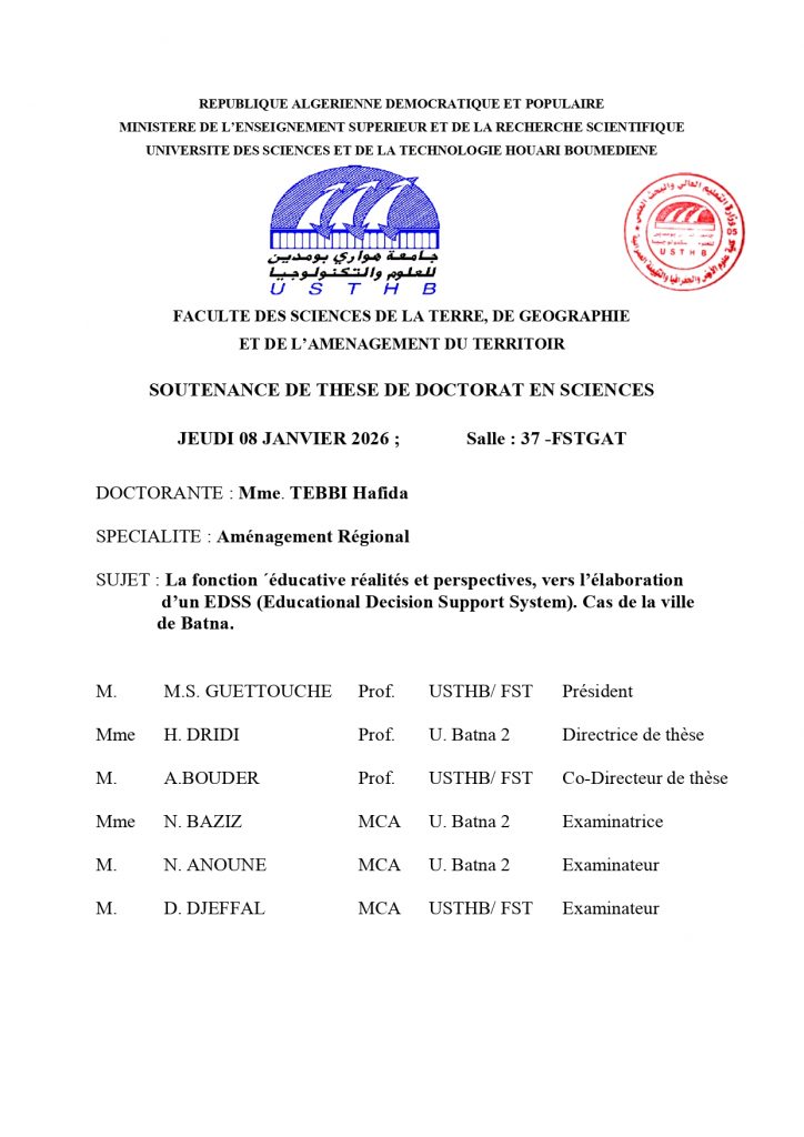 FACULTÉ DES SCIENCES DE LA TERRE DE LA GÉOGRAPHIE ET DE L'AMÉNAGEMENT DU TERRITOIRE